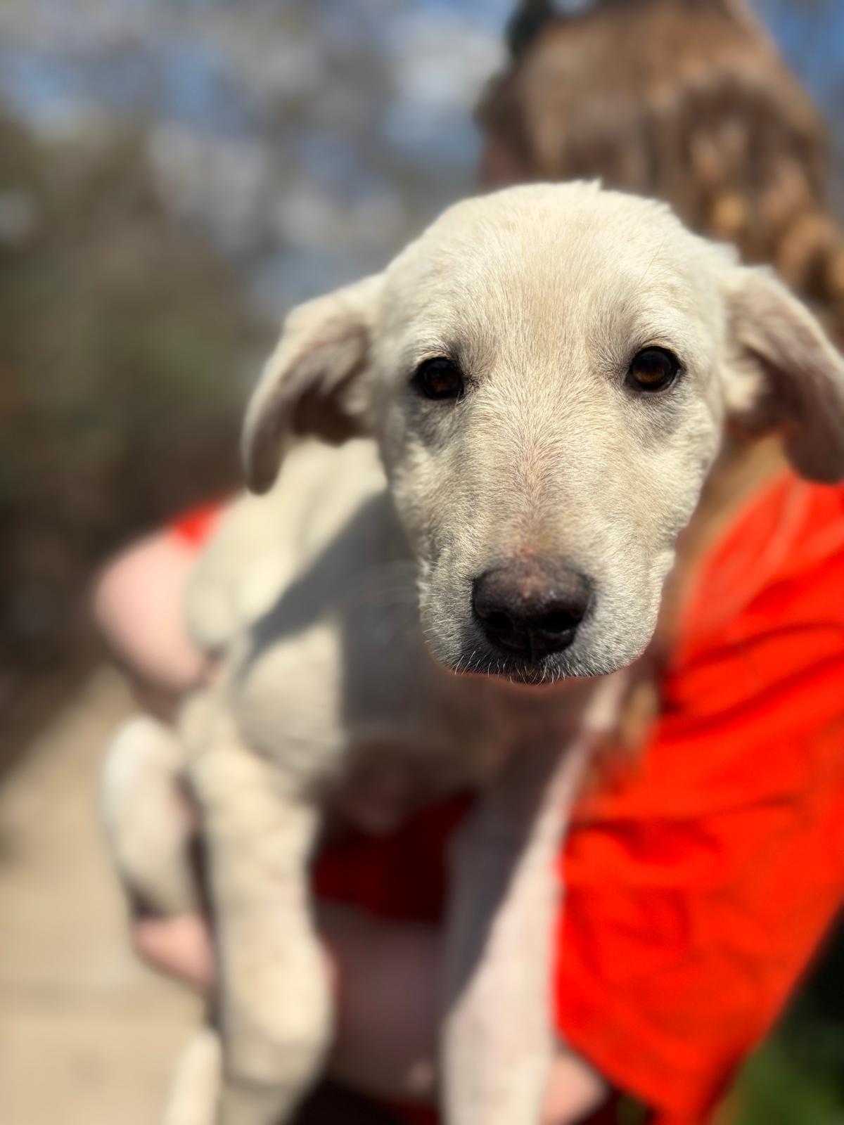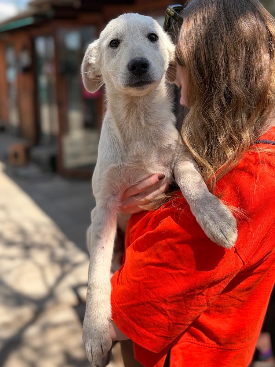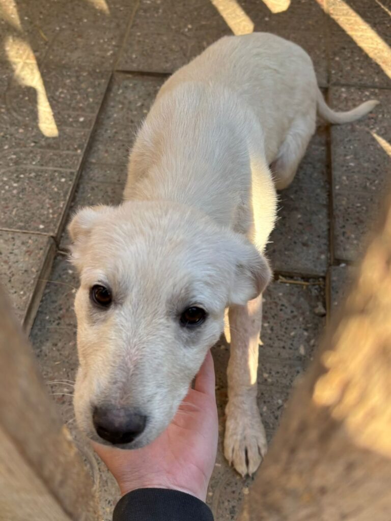 Möwe wurde im Alter von nur wenigen Monaten in fernab von Wohnsiedlungen mit Motte und ihrer Schwester Meise am Wegesrand gefunden. Die Welpen haben dort zwischen Müll gewohnt. Unsere Tierheimleitung hat die Welpen über Wochen täglich gefüttert. Anfang April 2026 wurde Möwe von einem Auto angefahren und brach sich das linke Vorderbein. Beti sammelte sie ein und wir ließen Möwe von unserem Tierarzt operieren. Möwe hat die Operation gut überstanden und erholt sich nun mit Motte und Meise im Tierheim.