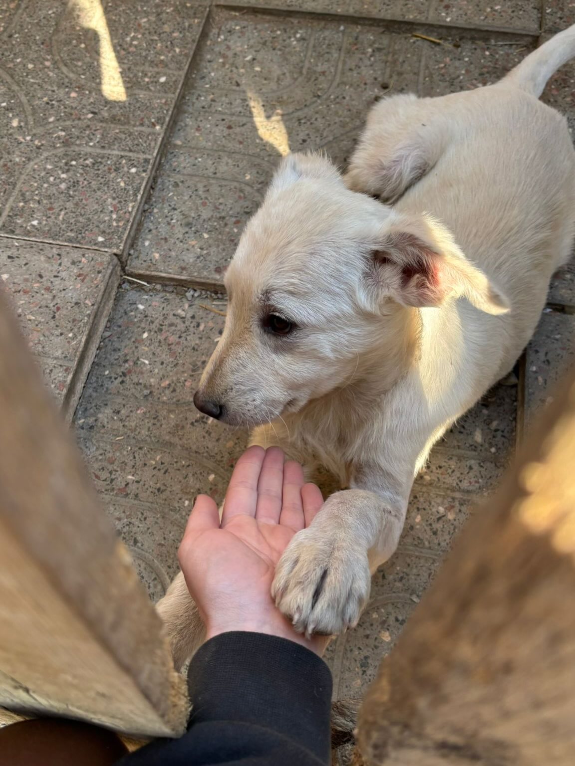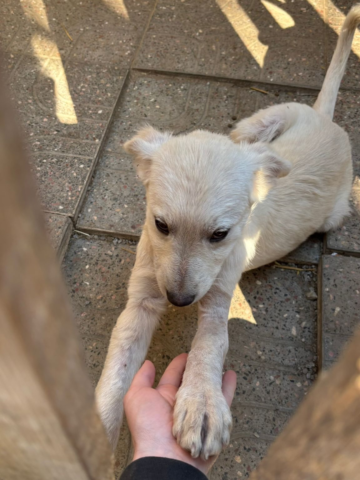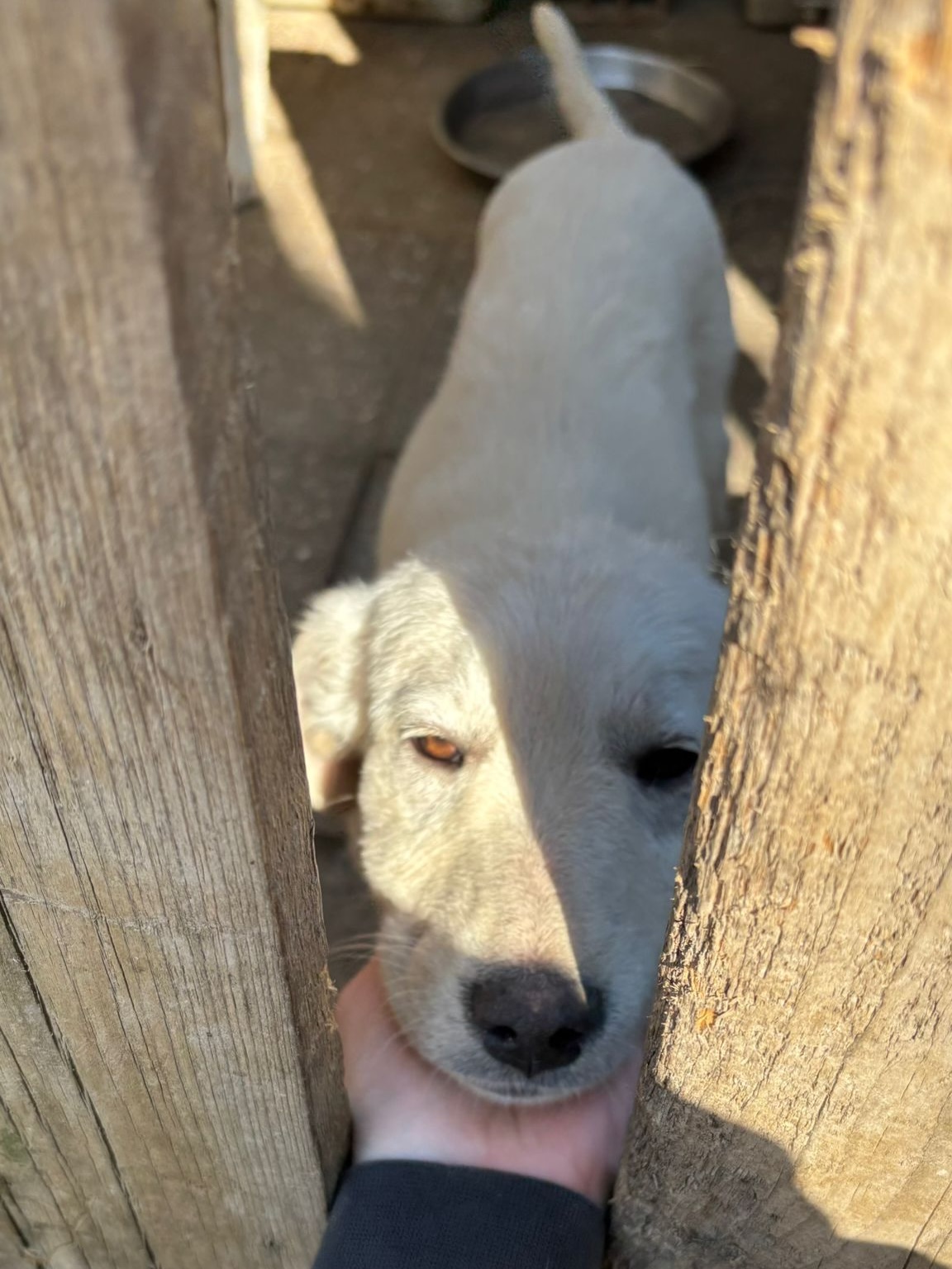Möwe wurde im Alter von nur wenigen Monaten in fernab von Wohnsiedlungen mit Motte und ihrer Schwester Meise am Wegesrand gefunden. Die Welpen haben dort zwischen Müll gewohnt. Unsere Tierheimleitung hat die Welpen über Wochen täglich gefüttert. Anfang April 2026 wurde Möwe von einem Auto angefahren und brach sich das linke Vorderbein. Beti sammelte sie ein und wir ließen Möwe von unserem Tierarzt operieren. Möwe hat die Operation gut überstanden und erholt sich nun mit Motte und Meise im Tierheim.
