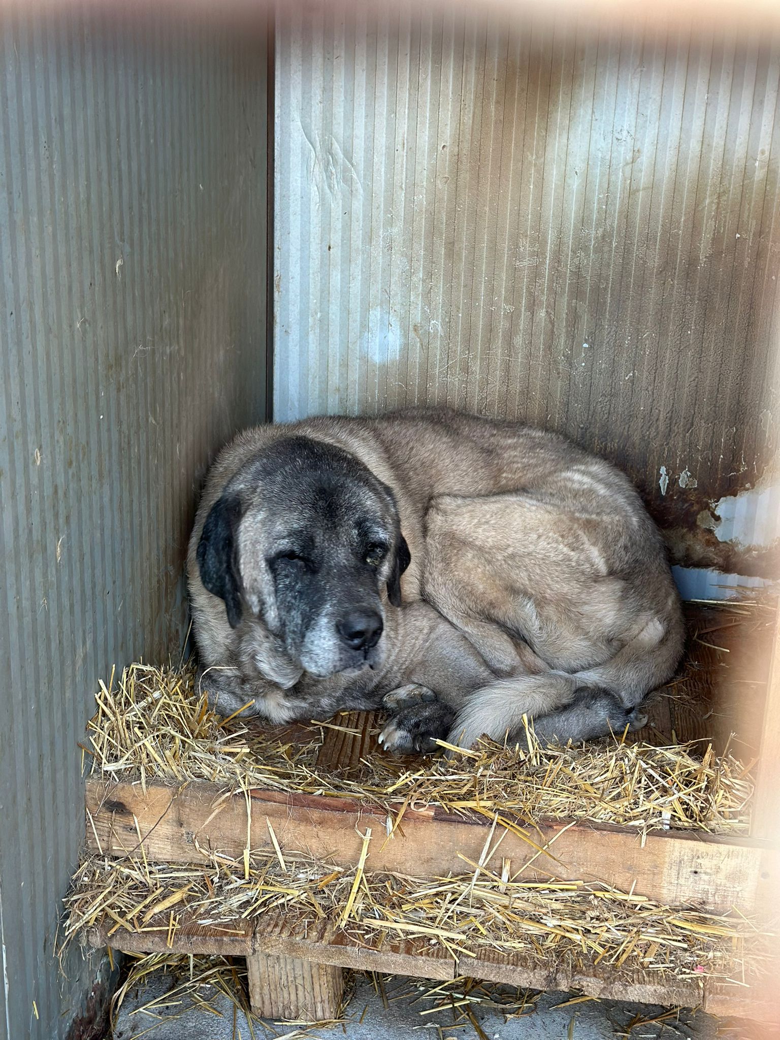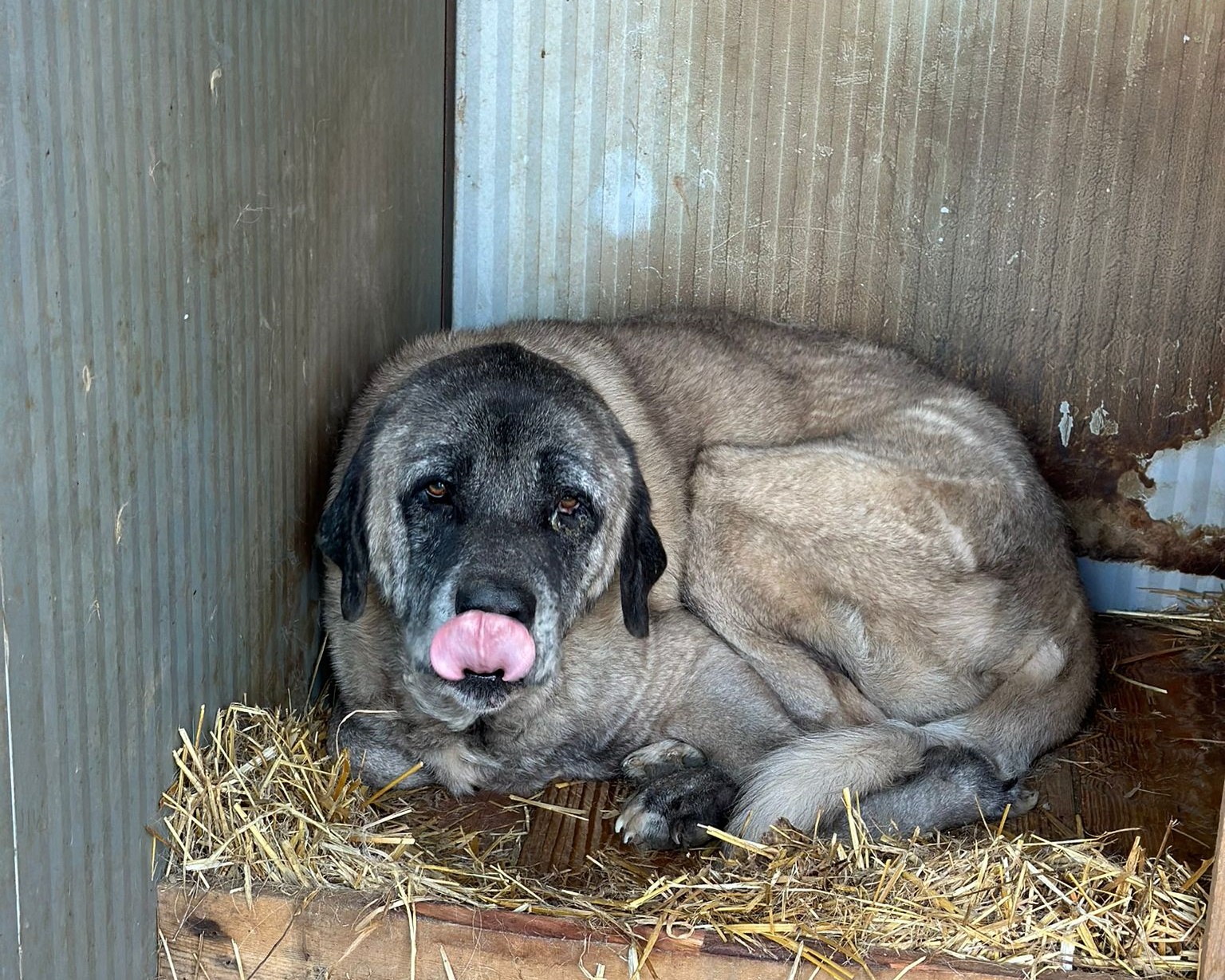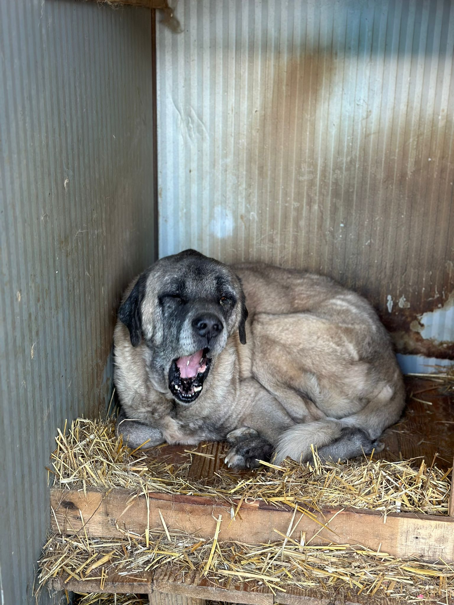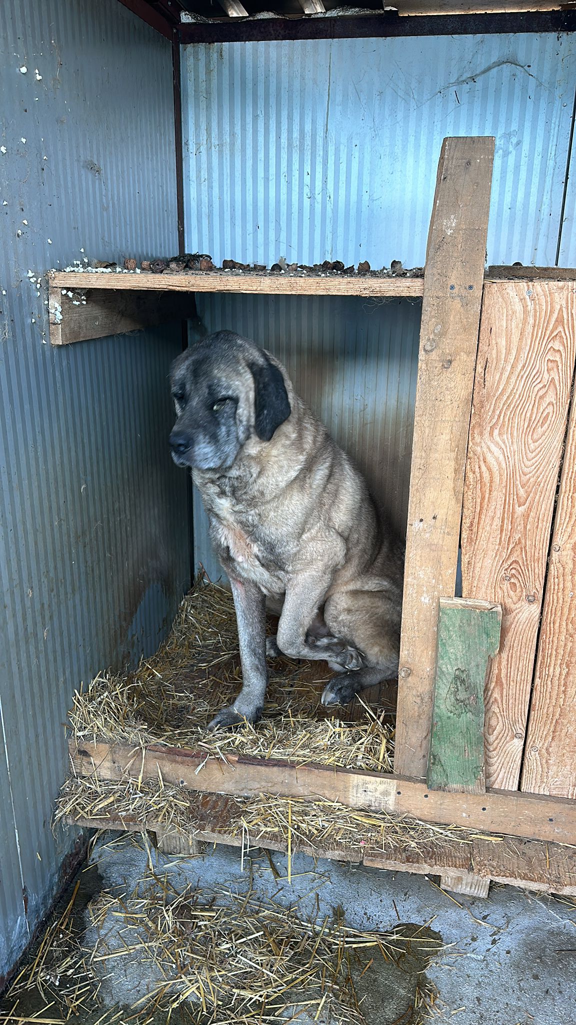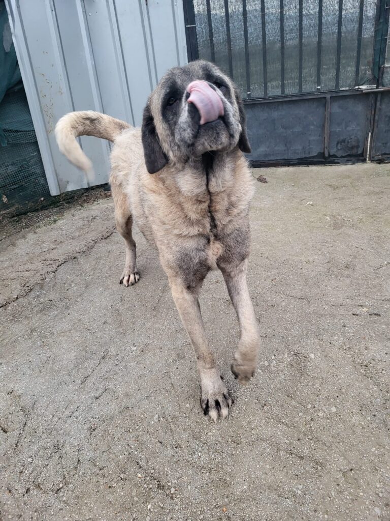 Bernd ist ein etwa 2020 geborener Kangal-Mix, der vor zwei Jahren während einer Schießerei auf Straßenhunde in Struga angeschossen wurde. Seitdem ist er schwer behindert und hat Kugeln im Bein und Rücken, die nicht entfernt werden können.